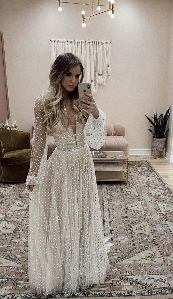 Elegant A Line Sexy V Neck Long Sleeve Beach Boho Wedding Dress Bridal Gown