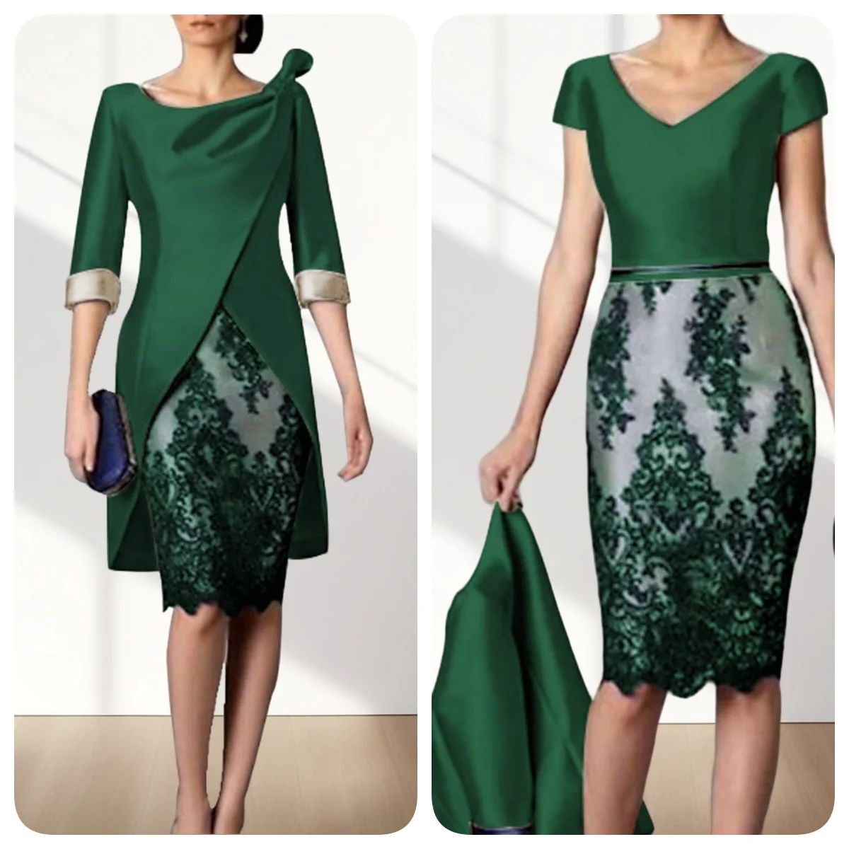Two Piece Mother of the Bride/ Groom Dress Wedding Guest V Neck Knee Length Satin Lace 3/4 Sleeve Jacket Dresses