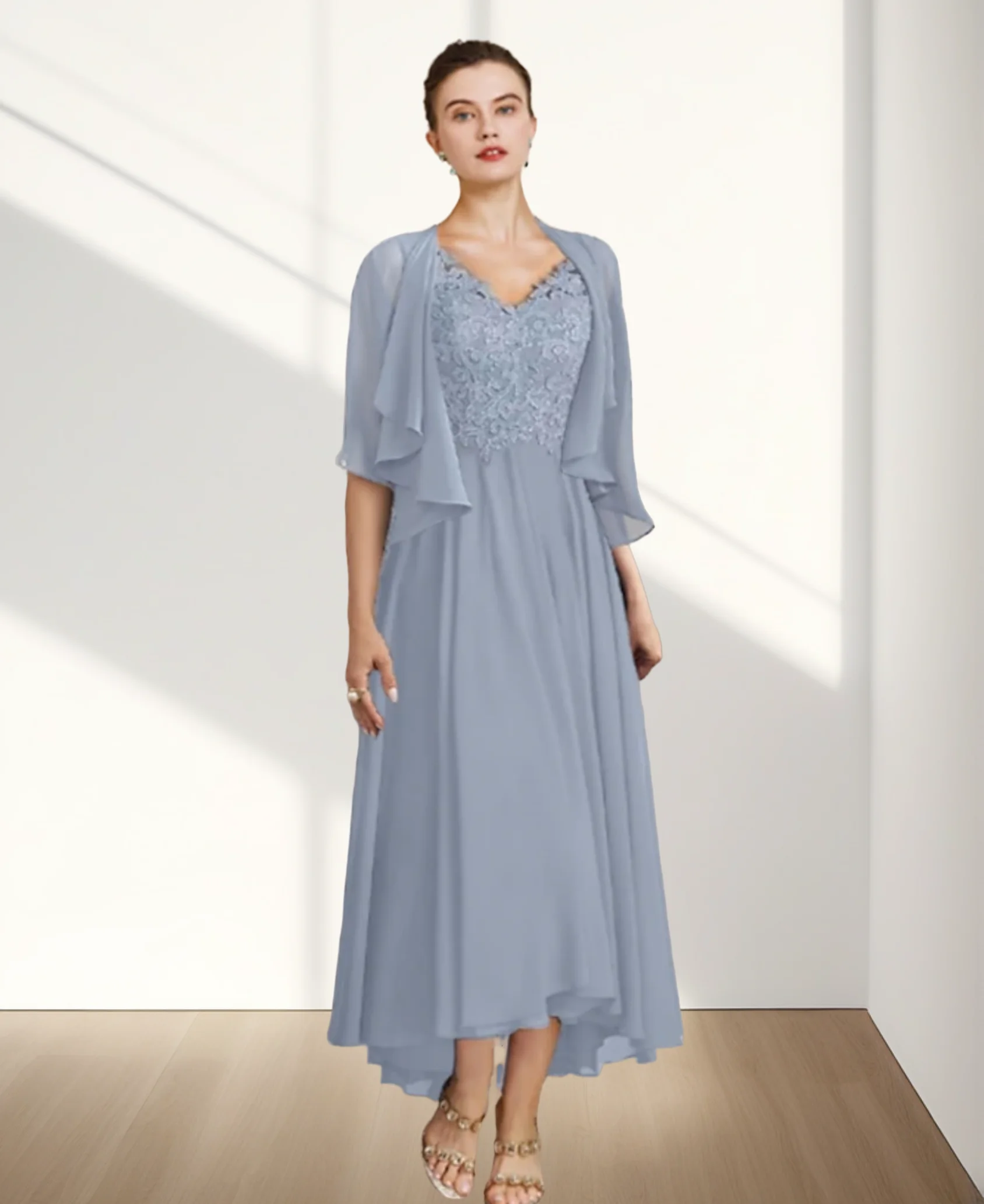 Mother of the Bride/ Groom Dress Wedding Guest Elegant Vintage V Neck Ankle Length Chiffon Lace Half Sleeve with Applique