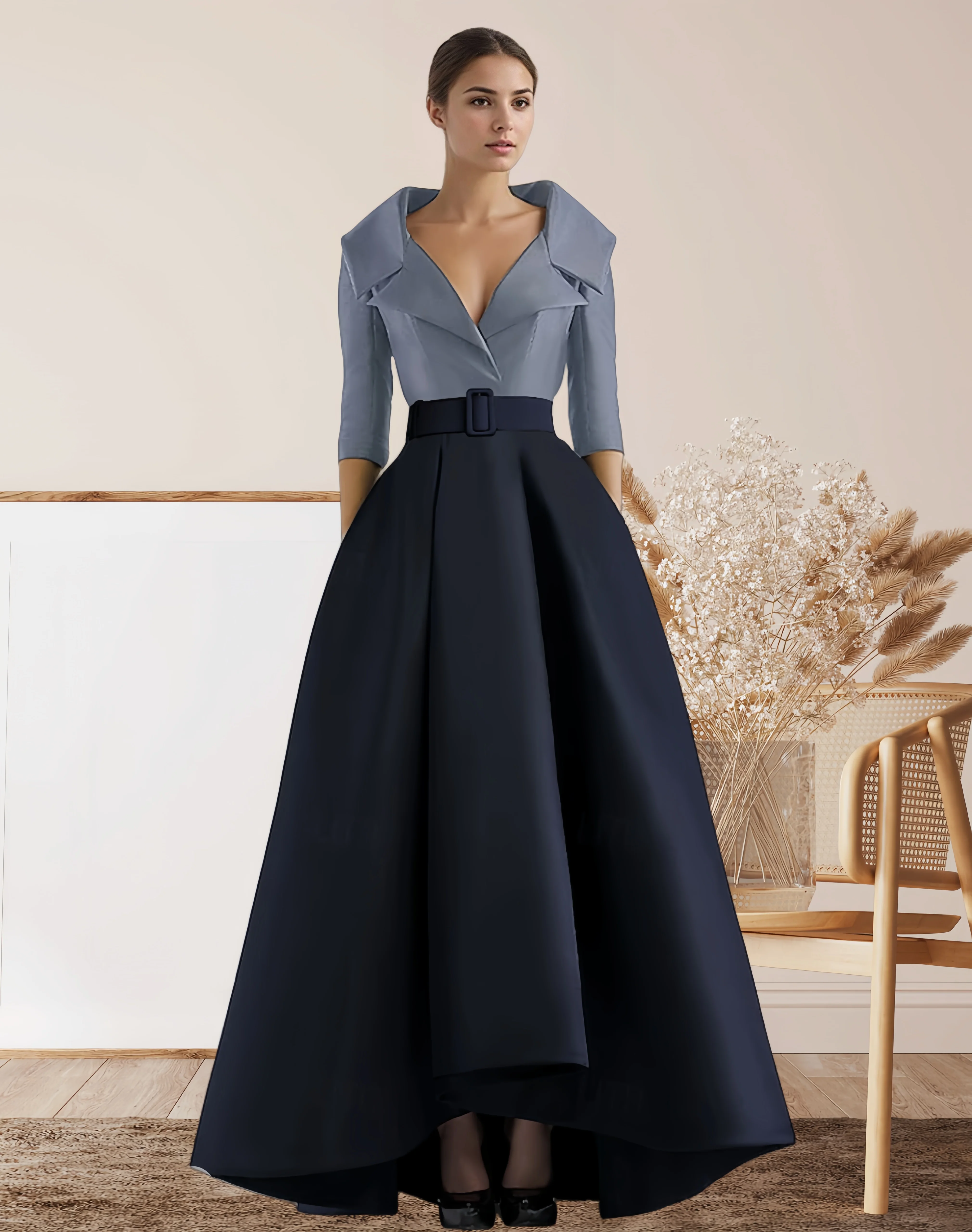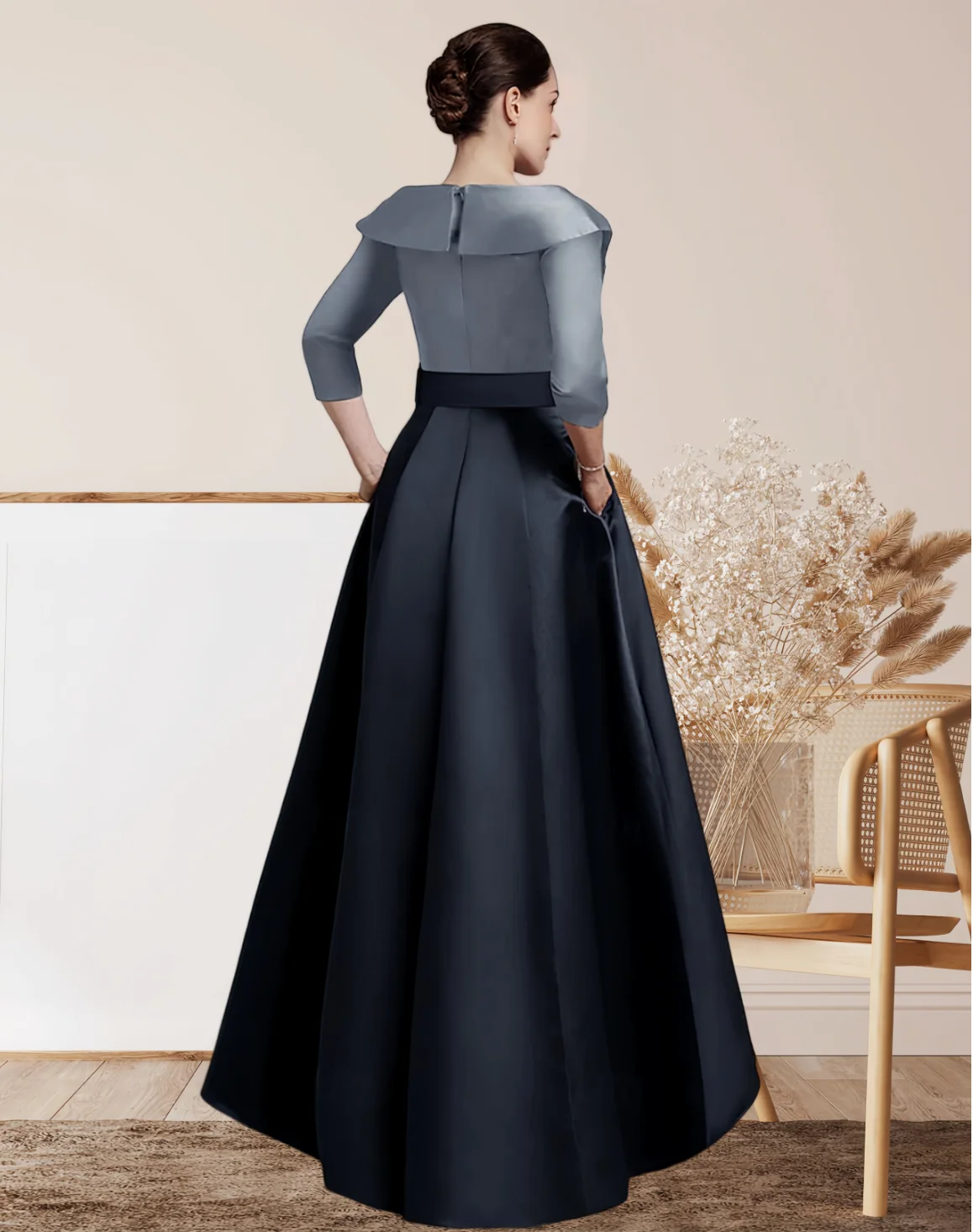 A-Line Satin Mother of Bride/ Groom Dress Formal Evening Gown Elegant Fall Wedding Guest Dress Asymmetrical 3/4 Length Sleeve with Pocket