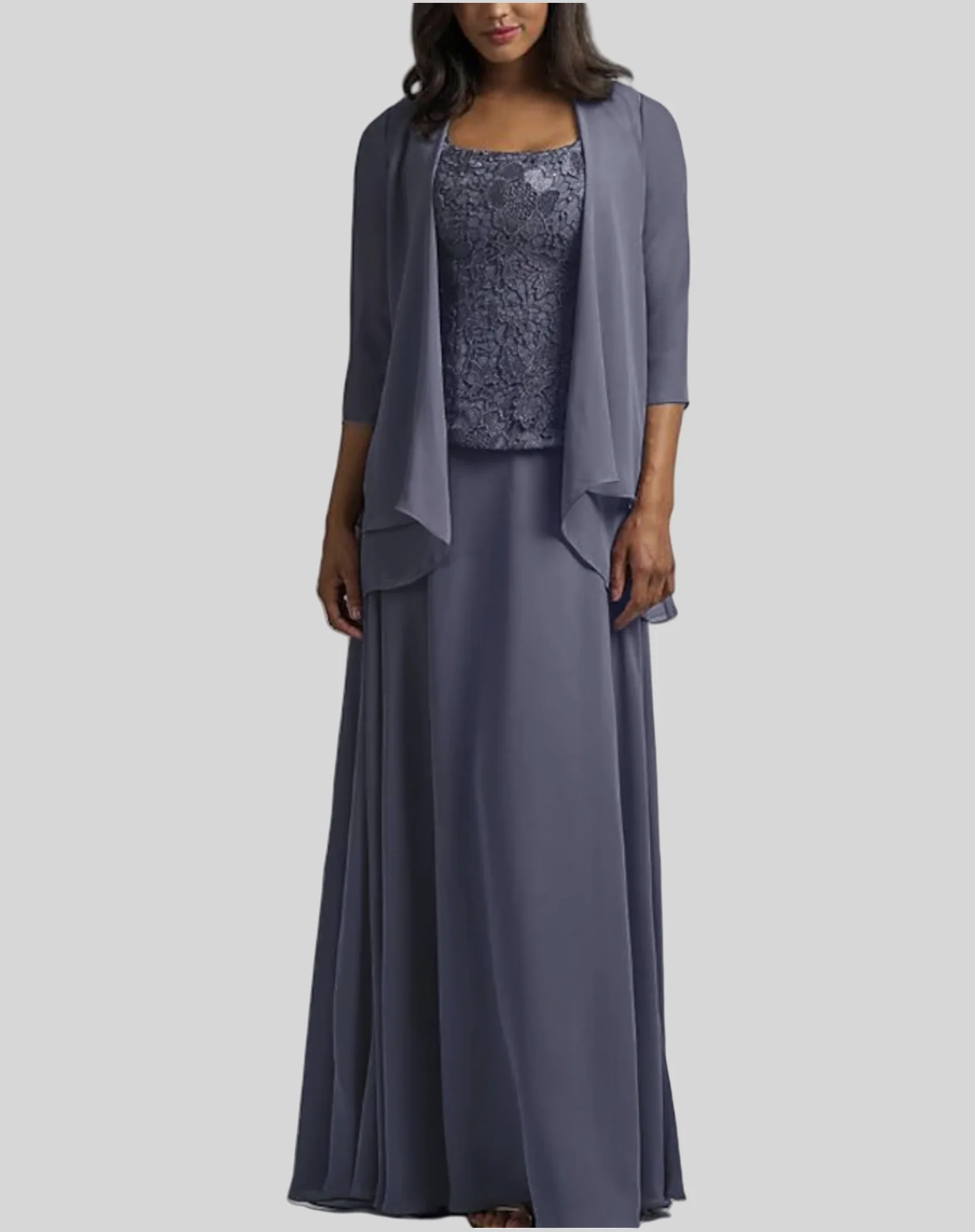 Two Piece A-Line Mother of the Bride/Groom Dress Elegant Square Neck Floor Length Chiffon 3/4 Length Sleeve with Lace
