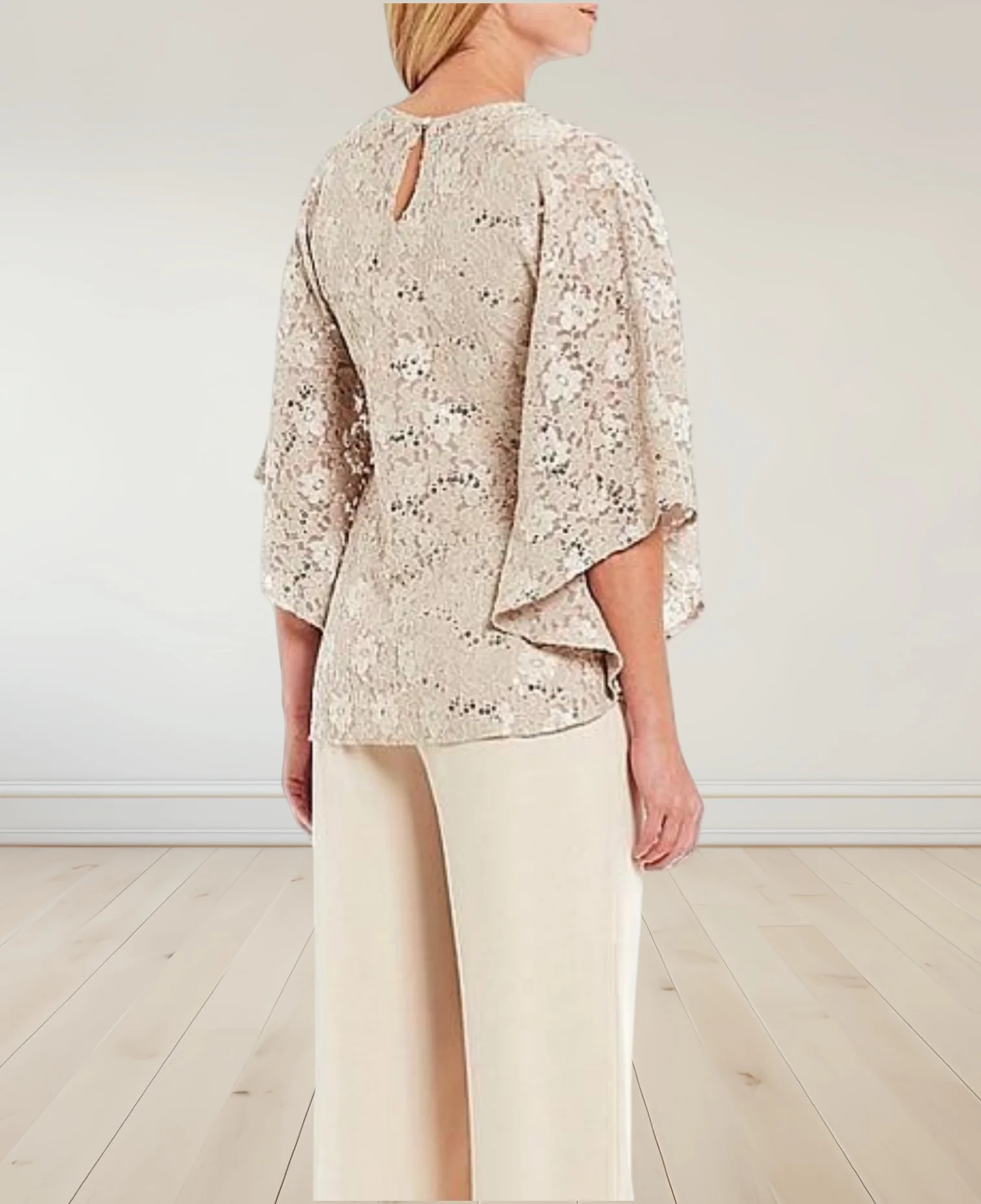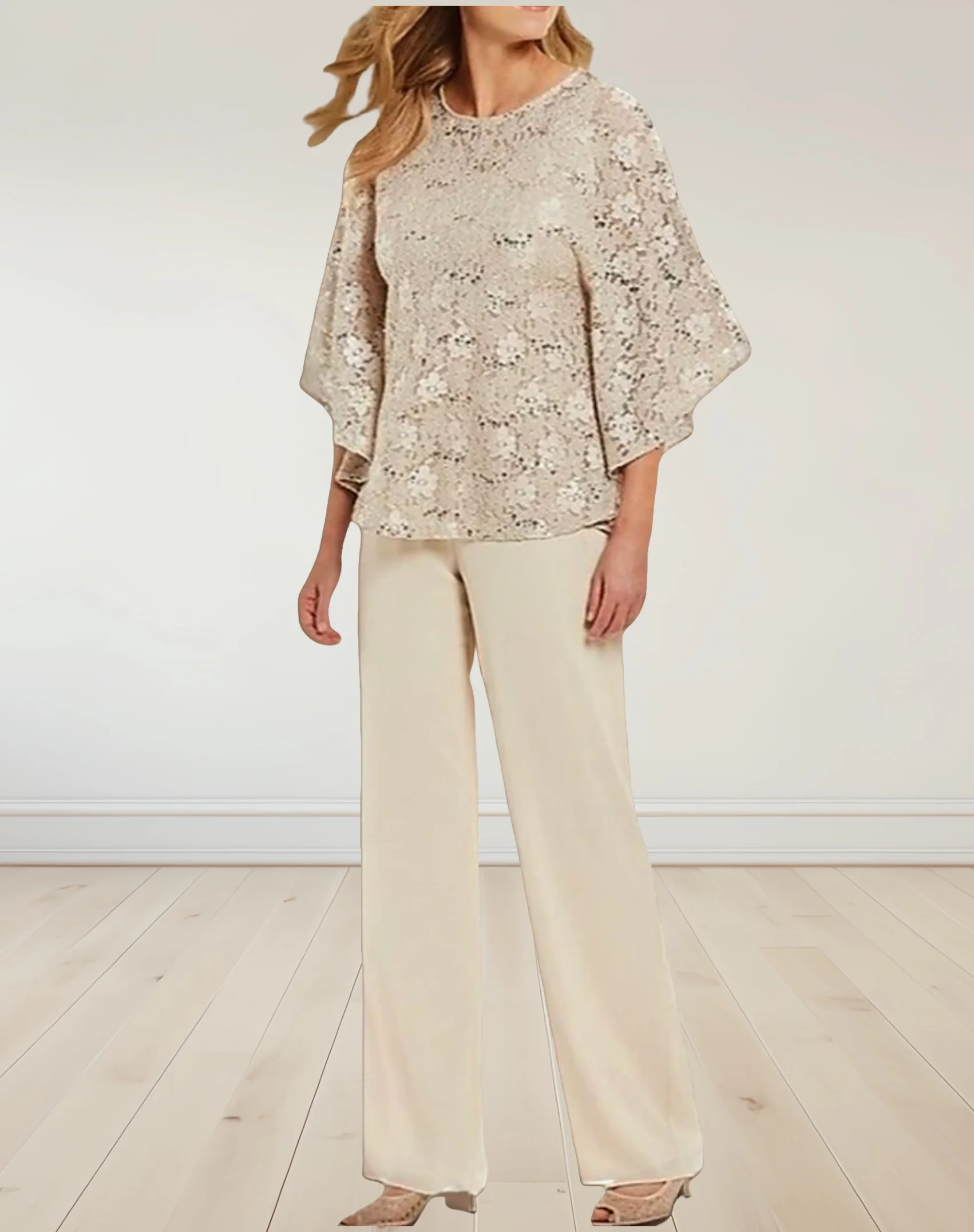 Pantsuit 3 Piece Mother of the Bride /Groom Dress Formal Wedding Guest Jewel Neck Floor Length Chiffon 3/4 Length Sleeve with Lace