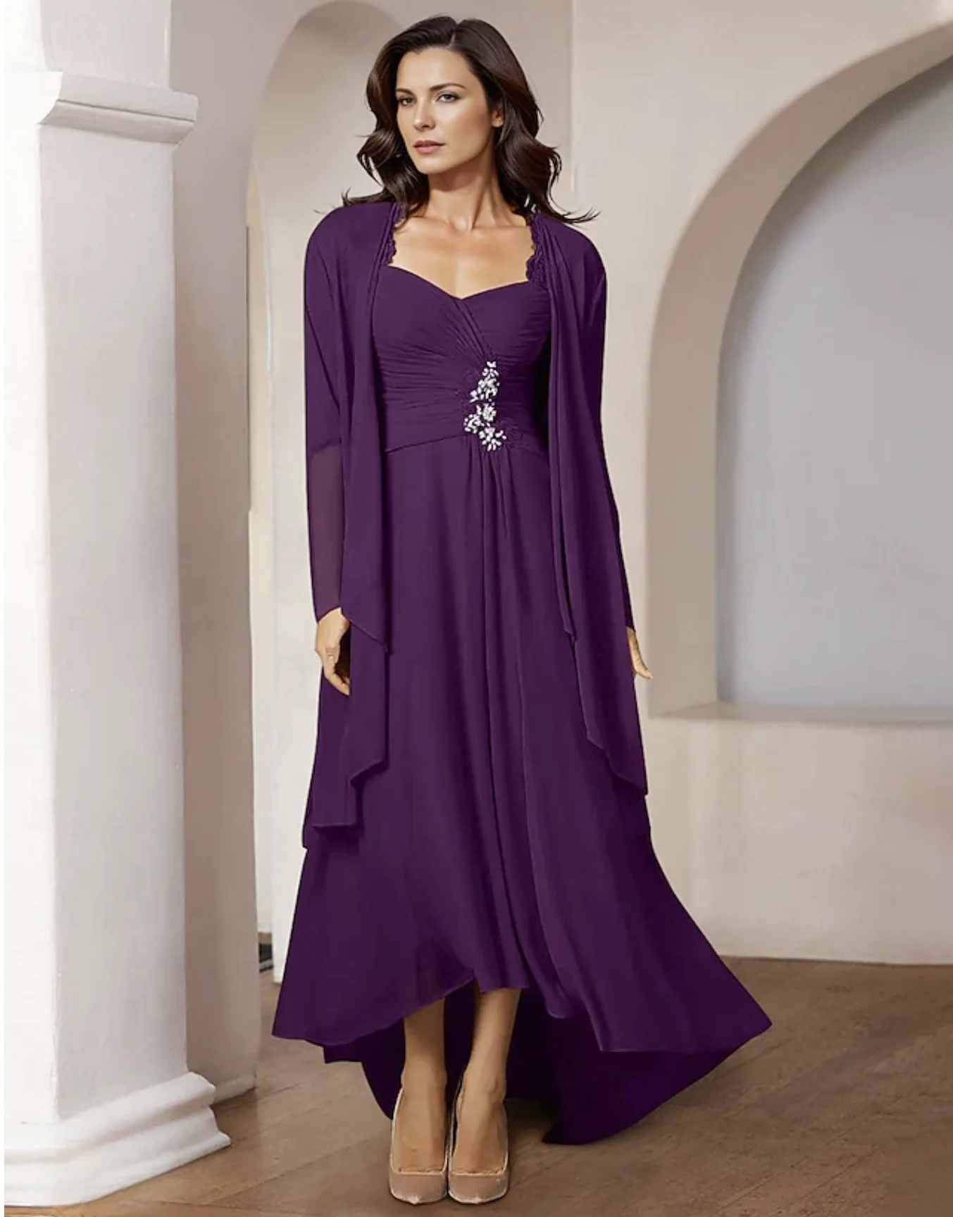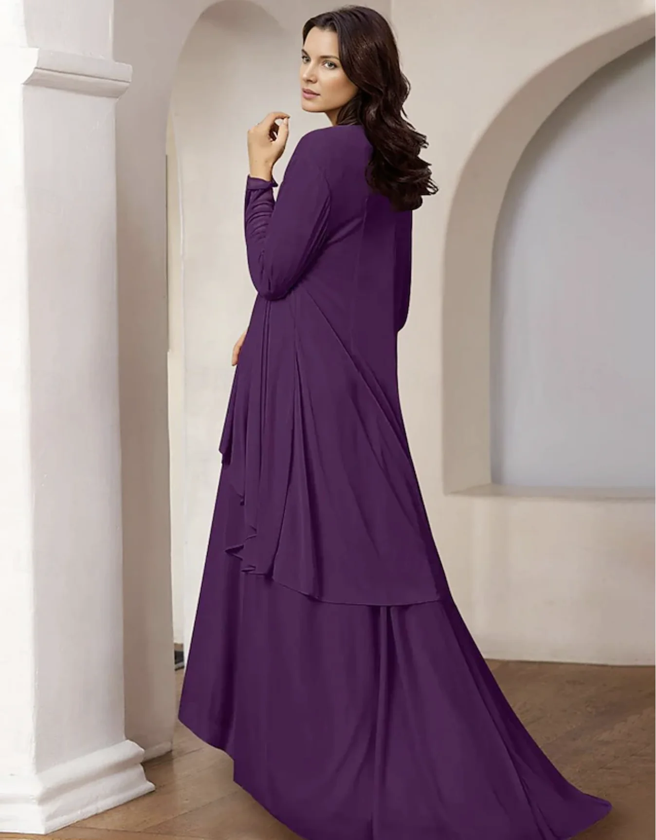 Two Piece A-Line Mother of the Bride/Groom Dress Elegant Wedding Guest Vintage Chiffon Long Sleeve with Lace Ruched