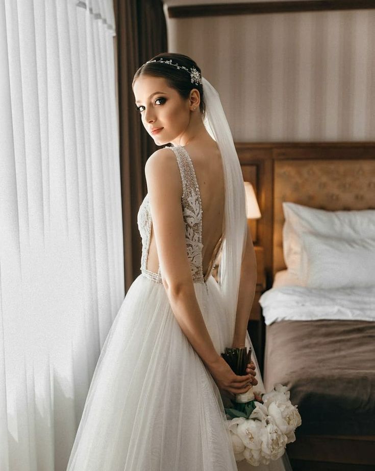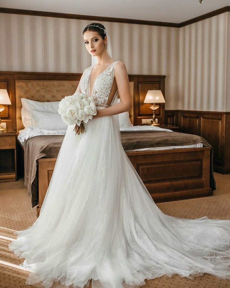 A-line Wedding Dress, Luxury Deep V-neck Wedding Gown, Tulle Wedding Dresses