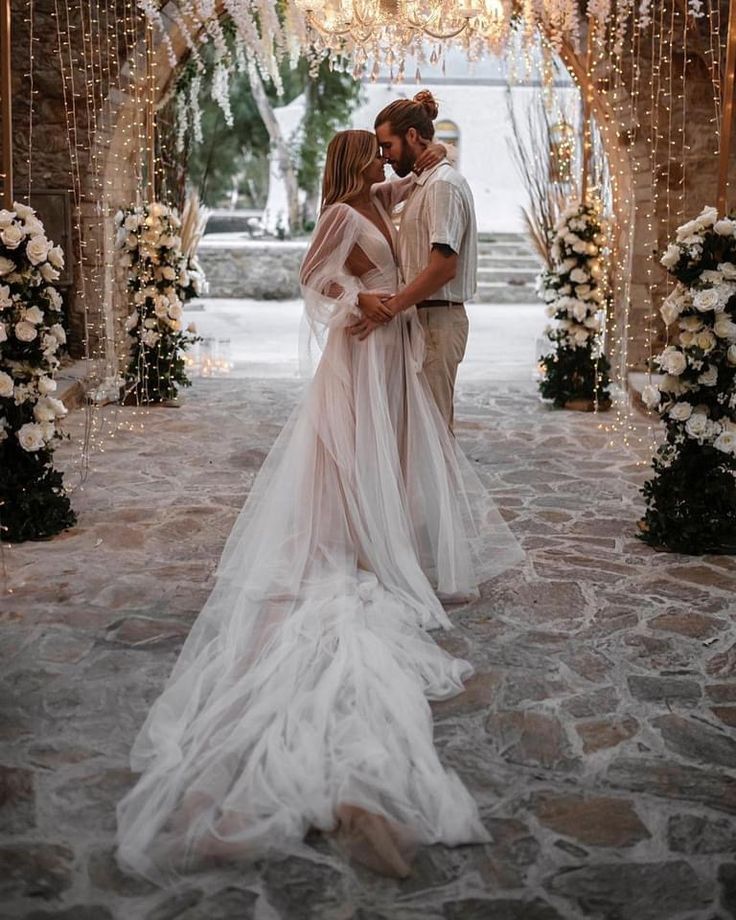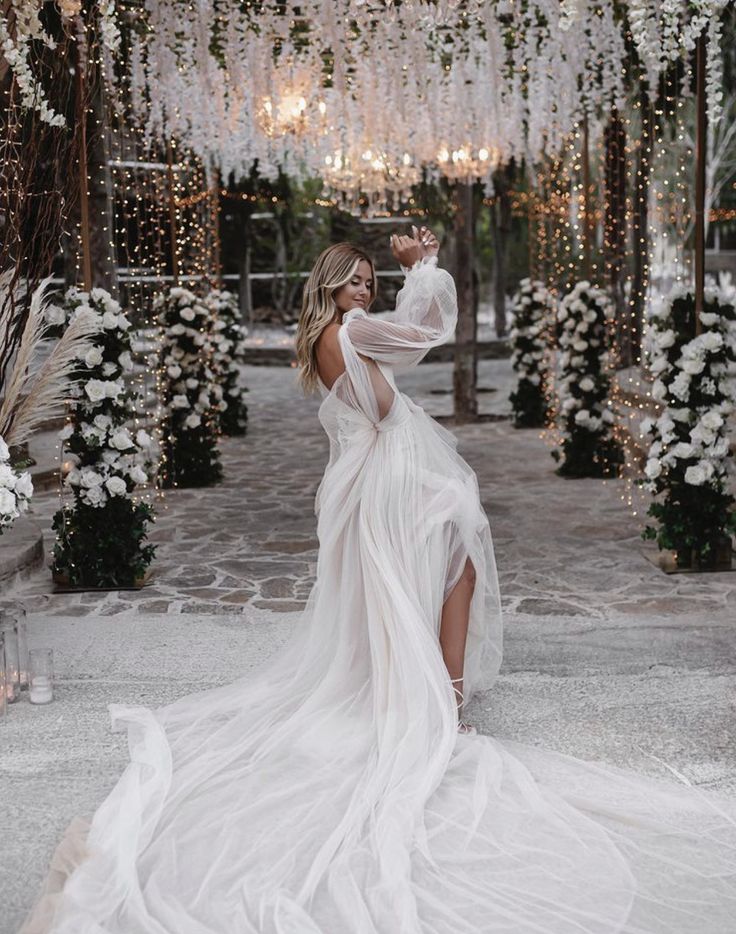 Sexy A-line Dep V-neck Wedding Dress, Long Sleeves Tulle Wedding Gown Bridal Dress