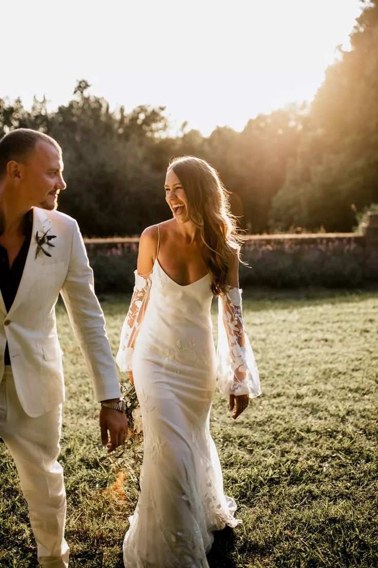 Sheath Wedding Dress with Lace Long Sleeves, Open Back Satin Wedding Gown Bridal Dress