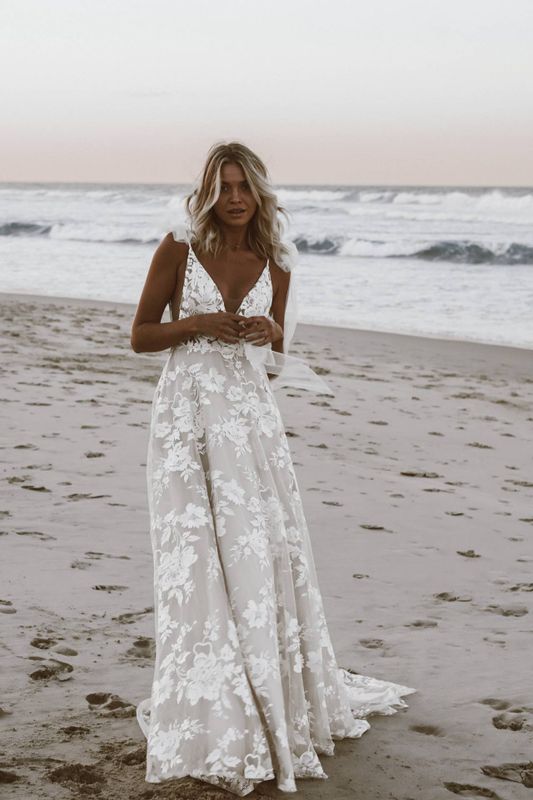 Beach Appliques Lace Wedding Dress, Deep V-neck Tulle Bridal Dress Wedding Gown