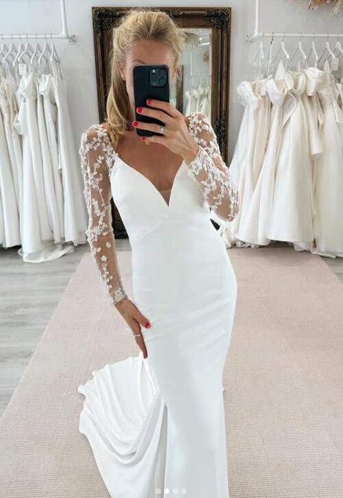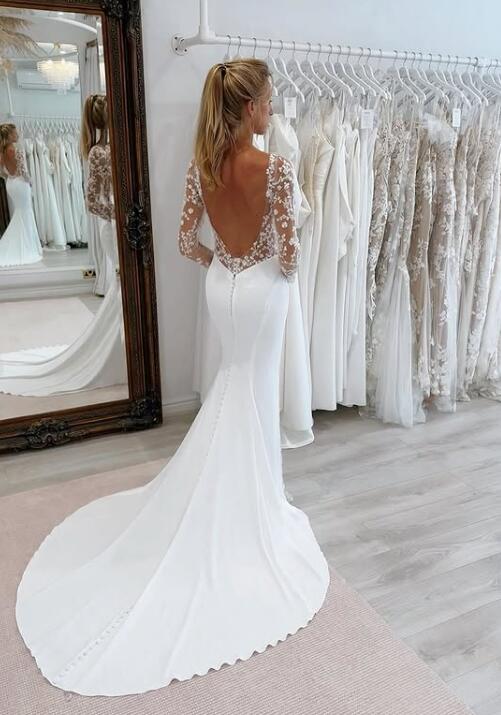 Sexy Mermaid Long Sleeves Backless Satin Wedding Dress Bridal Dress Wedding Gown