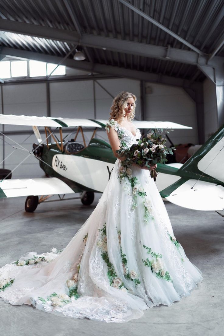 A-line V-neck Wedding Dress, Floral Flowers Wedding Gown Bridal Dress